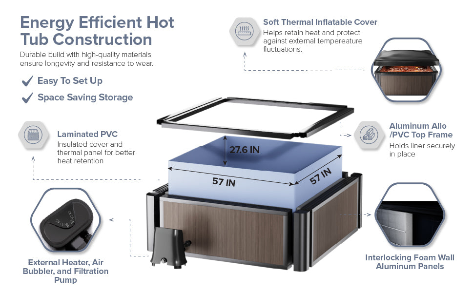 The easiest way to elevate your home spa experience with the Square Panel Foam Hot Tub, designed for comfort, efficiency, and modern style. Built with durable laminated PVC, reinforced aluminum alloy panels, and ECO foam insulation, it delivers superior structural support and thermal retention. The clean square shape offers a spacious interior while fitting seamlessly into patios or backyards. Ideal for all seasons, this foam jacuzzi spa provides a relaxing, energy-efficient retreat right at home.