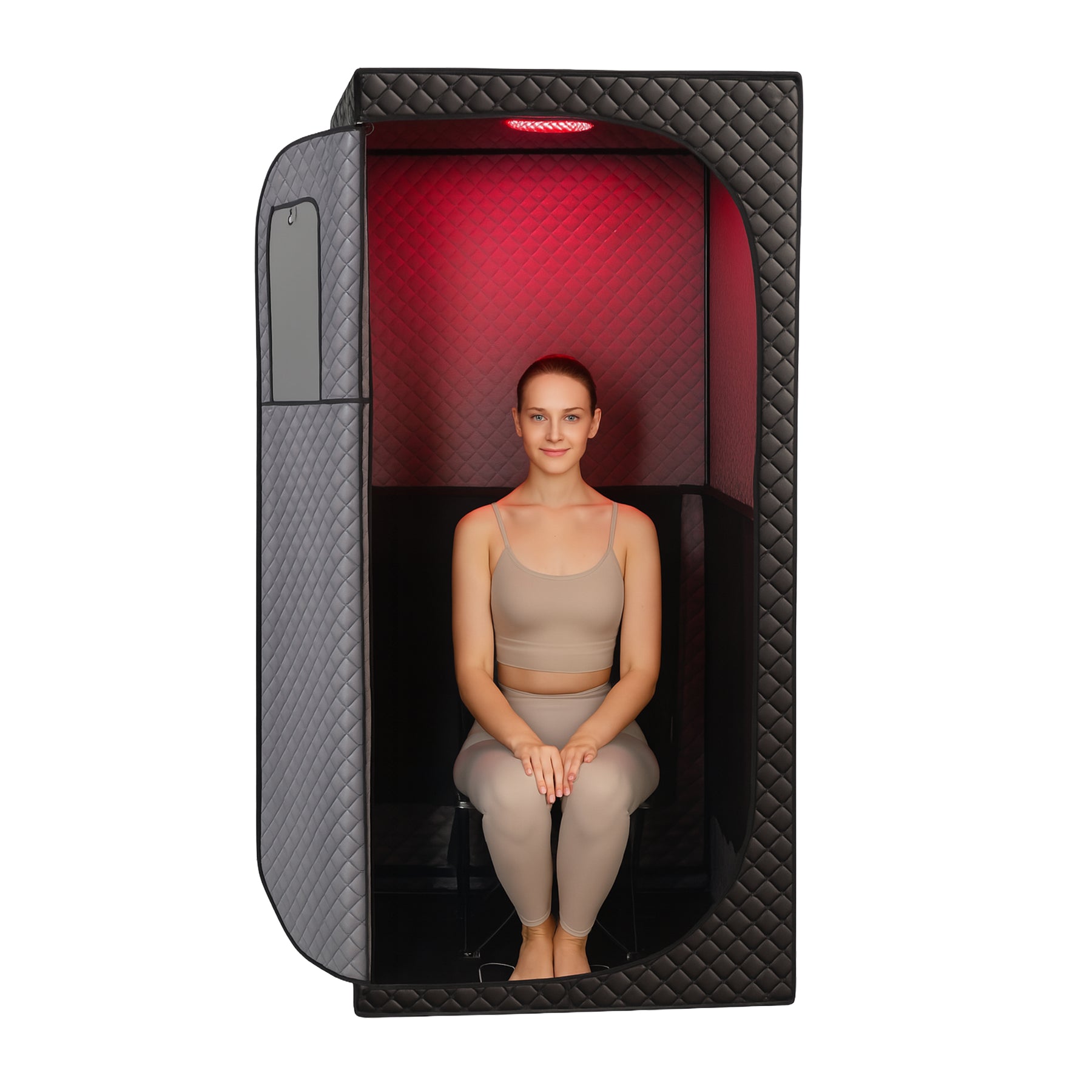 Woman sitting in a Sauna Tent with Red Light therapy